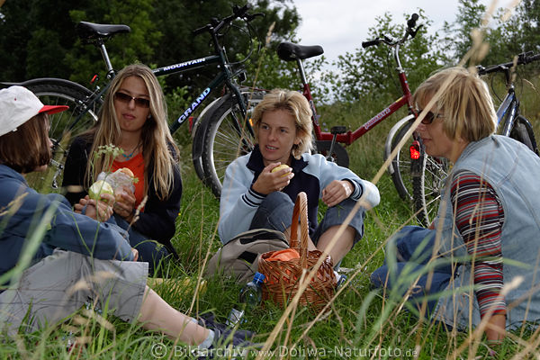 essen, sich stärken, plaudern beim Radausflug, Ausflug mit Rad, Naturausflug in Masuren, Mädchen mit Fahrradräder auf Biketourstop, Mädels Freude unter sich, Girls picknick on nature with bicycle in Masuria land