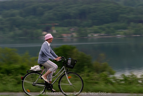 auf Schweizer Seite, Schweizer Ufer vom Bodensee, Radel-Ausflug radfahren mit Damenfahrrad, in Damenhut unterwegs in Natur mit Rad vor See, Radtour mit Zweirad. Bicycle girls at Lake Constance