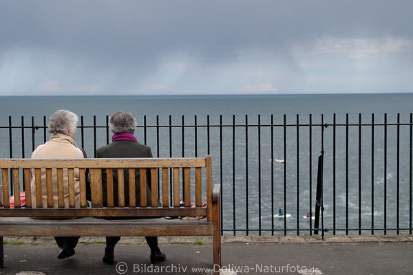 Relax am Meerufer auf Seebank vor weitem Wasser, fernen Horizont, Seehorizont mit Wolken, Natur frische Luft atmen an Seepromenade im Urlaub, Menschen Lifestyle & Freizeit in Fotografie als Poster Print, England Reisebild