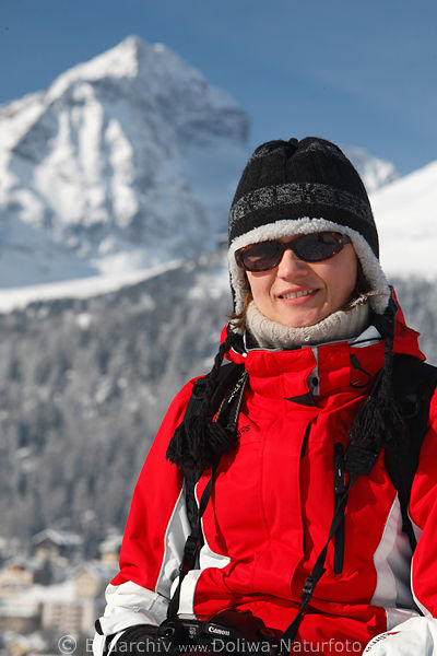 Frau sportlich angezogen Gesicht unter niedlichen schwarzen Wintermütze Fotografie in windfesten Sportkleidung macht es auch im Frost und Schnee Spass in Bergen winterlichen Alpen