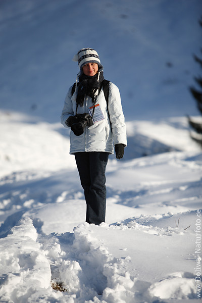 Mädchen schwarzweiße Winterkleidung Bild mit passendem Schwarzschal dazu, windfest & frostfest sportliche Wintermode für Freizeit Naturausflug in Berge Fotografie posierend mit Kamera