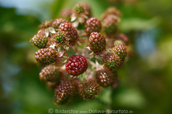 Rubus fruticosus Dornenstrauch Beerenfrüchte Fotografie aus Garten, rotgrün Obstkugelchen, Beere Frucht zum Naschen, noch unreif in in Foodphoto, zum Pflücken erst im September. Bioobst gesunde Nahrung auf Früchtenstrauch hängend, reifend, Beerenobst