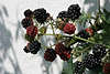 red-green berries fruits image, eat Rubus fruticosus picture into leaves