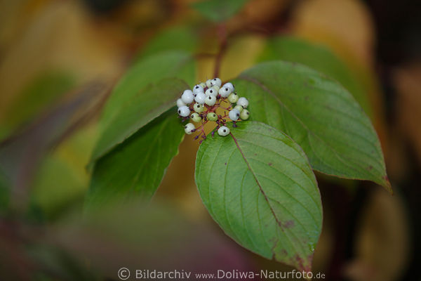 Hartriegelgewächs Früchte zur Gewinnung von Öl zur Seifeherstellung, beliebte Heckenpflanze, Ziergehölz ovale Blätter vor gelbem Hintergrund Strauch Weißbeeren Nahbild rote Triebe Cornaceae Beerenfrucht, Cornales Makrofoto, andere Art: Roter Hartriegel Cornus sanguinea