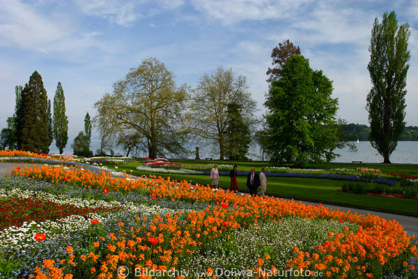Blumenlandschaft Gartenfotografie, orange Farben buntgefärbte Blütenpflanzen Wiesen vor Bäumen am Seeufer Bodensee Wasserblick über Flora Gärtnerkunst Aufnahme, Flowers orange colors beauty garden landscape island mainau travel impression