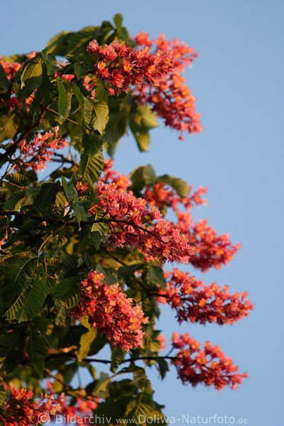 rotblühend in Sonne bestrahlt am Baum, Rotblühende Kastanien castanea savita Blütenähren, Buchengewächse Rotblüten. Rosskastanie nicht essbar, Blüte rot-blühend am Baum mit Blätter.