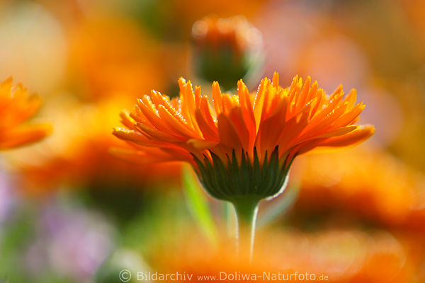 Rabatte roter Ringelblumen in Sonne Fotodesign farbenfrohe Fotografie Blütenpflanzen rot-orange Blüte, rotfarbene eingerollte Blütenblättchen in Nässe, beliebte Gartenblume Blumenbild, Blumenblüte orange-rot grüner Blütenkopf leuchtend im Gegenlicht Blumendesign