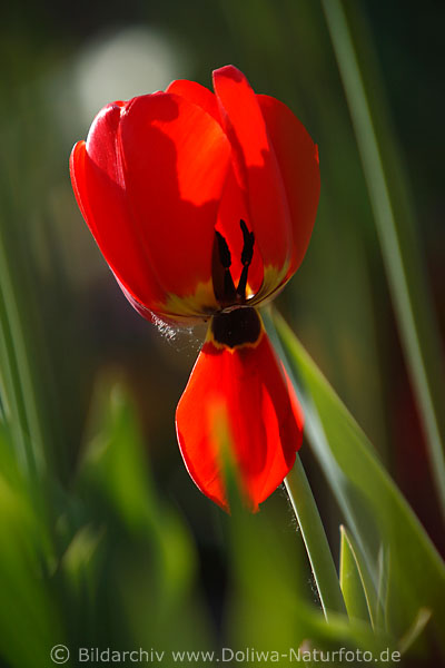 Tulpenblume innen schwarzer Griffel Staubfaden mit Staubbeutel Nahaufnahme roter Zwiebelpflanze Blütenkelch Blütenblatt, Vergänglichkeit Makromotiv Floradesign aus glänzendem Garten