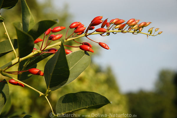 Koralowy krzew gałązka kwiat zielone liście zdjęcie, roślina z Brazylii, czerwono kwitnące kwiaty fotografia