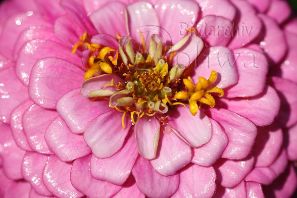 Zinnienblume leuchtende Blättchen Makrofoto violetten Sommerblumenblüte Fotografie. Zinnia yellow pink-flower Zinnia macro photo fresh bloom gardenplant image in the rain, flora photography