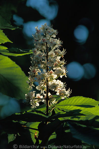 Edelkastanie, Rosskastanie Blütenstand, weiss Knäuel, weißblühend in Sonne bestrahlt am Baum, Grünblätter mit Reflexen