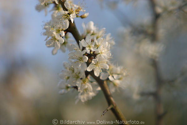 Schlehen blühend in Frühjahr Fotografie, Prunus spinosa am Sträucher, Weissblüte in Blütezeit Naturfoto Blütenpflanzen