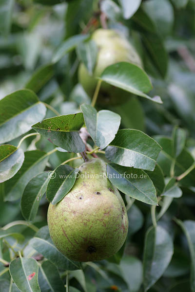 Obst Rosengewächse Kernobst Birnenart in Baumblätter, Fruchtreife in Naturgarten