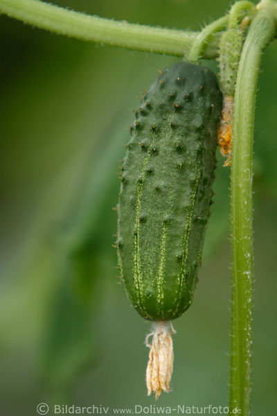 Grünfrucht Gurken werden unreif geerntet als grünes frisches Gemüse, weil nachher sind sie gelb, groß und ungeniessbar. Pflanzenfrucht aus Garten in Lebensmittel Nahrung Fotografie Gartenfrüchte art Cucurbitaceae und Kürbisgewächse