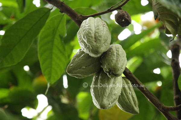Kakaofrucht Fotografie Kakaobaum Theobroma cacao exotischer Obstbaum Tropenfrüchte grüne Samen mit Bohnen Fruchtreife am Zweig unter Blätterdach wachsen pflanzliche Nahrung Bild. Cocoa food fruits group at tree fresh ripe photos vegetables pictures