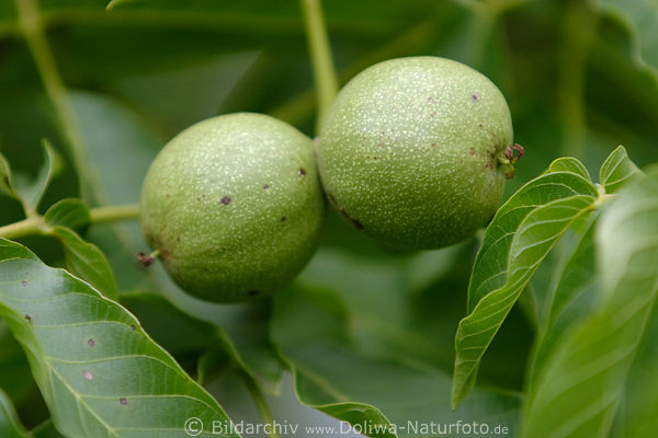 gesunde ölhaltige Samen, Schalenfrüchte essbare Kerne, Aussenschale in Foodfoto. Walnut pair photo Stone-fruits in green peel, nuts edible exotic nut-fruit in food picture. Orzech włoski na drzewie zielony rosnący w liściach w owoce roślin fotografia