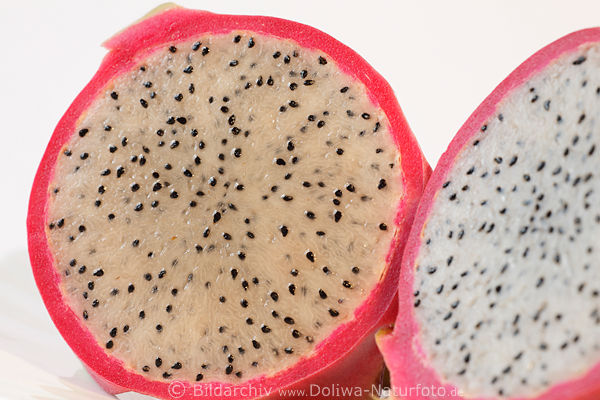 Dragon fruit-disk photo pulp Grains Thai exotic fruit photo Hylocereus undatus food picture-archive, redfruit white kernel, Southeast-Asia fruits photography