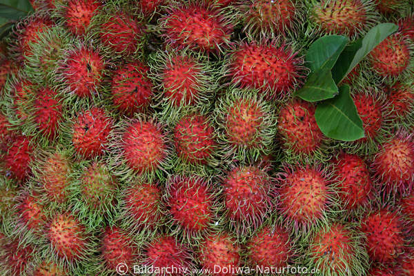 Leckeres Obst aus Südostasien kleine aussen rötliche Früchte Obstmenge Fotografie vom Marktstand in Bangkok aus Thailand, innen ähnlich der Lychee, mit weißem Fruchtfleisch, beliebte Frucht Fotoarchiv. Rambutan fruits picture exotic food from Thailand, Southeast-Asia