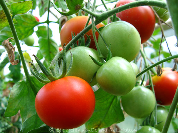 Bio-Tomaten, essbare Frucht Gemüse in Reife & Gartenfoto, Frischgemüse rote & grüne Tomatenfrüchte hängend am Tomatenstrauch. Gemüsepflanze, frisch & rund gesunde Kulturpflanze, essbare Lebensmittel, Nahrungsmittel, Frischgemüse in Foodfotoarchiv Bild