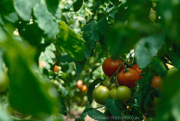 Frischgemüse rot-grün hängend am Strauch, Lycopersicon esculentum, essbare Lebensmittel, Nahrungsmittel, Gemüse rund, Tomato fruits picture, ripening in the garden, red-green fresh vegetable