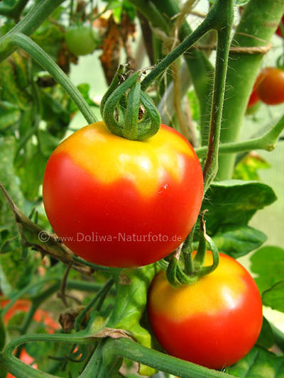 knallgelb, knallrot Tomatenart reif am Strauch - Lycopersicon esculentum, Fruchtreife im Garten, Familie Solanaceae essbares Gemüse, Lebensmittel, Nahrung, Nahrungsmittel Bild, Kulturpflanze Frucht und Gemüse