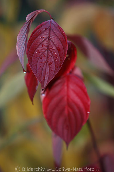 Ovale rotgefärbte Blätteradern zusammenlaufend in Bild der seltener strauchähnlicher Buntpflanze im Park. Pflanzenflora Herbstblätter Laub Fotografie in Nässe