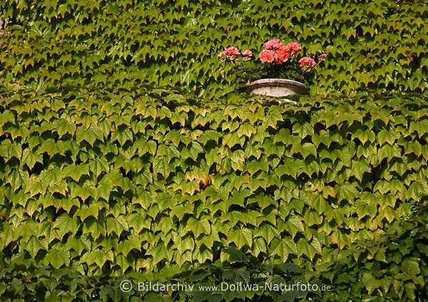 grüne Blätterpracht an Hausmauer versteckter Blumentopf getarnt in Blätter Foto, Gartenfotografie Grünblätter emporklettern mit Ranken an Wandmauer in Florafoto