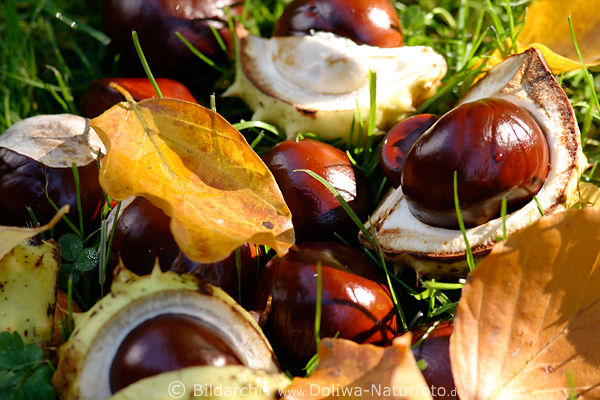 Buchenblätter, Laub Rotbuche über Kastanien in Schalen sonnenbeschienen, Herbstblatt über Pferdekastanien, Saukastanien, Gichtbaum. Horse-Chestnut images in autumnal leaves red-beech autumn leaf-photos