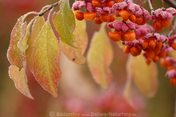 Euonymus europaeus Herbstblätter & Beeren, Pflanze Laubstrauch mit Früchten, Beerenstrauch für Menschen giftige Früchte m Herbstfotografie Herbstblätter Bilder Mean spindle-shrub leaves & poisonous berry-fruits. in the hoarfrost photo, rough-frost, poison-berry in autumn