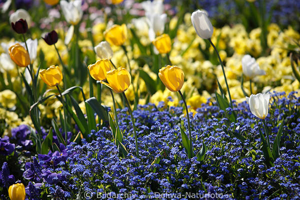 Tulpen im blauen Bodendeckerfeld bunte Vielfalt hübscher Blumenrabatte im Themengarten schleswig-holsteinischer Landesgartenschau 2011