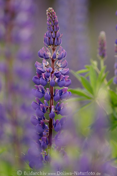 wilde Lupine Bluetenrispe in blau-grün Blumenfeld, Unschärfe im Feld, lila-blau Blüte, Schmetterlingsblütler, Leguminosae, Blütenstand bluhend