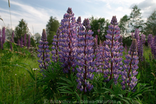 Vielblättrige Lupine Wildblumen hochstehende Blütenstände Naturbild vor Bäumen am Wald, Lupinus polyphyllus Blumengruppe Naturfotografie mit Weitwinkel dynamische Fotokomposition wilde Pflanzenflora