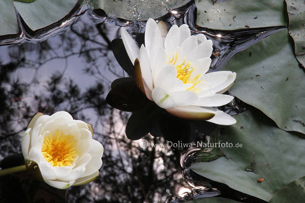 Nuphar weisse wilde Wasserpflanze mit gelber Blütenmitte an Grünblätter Nymphaea Blumen Florafotografie