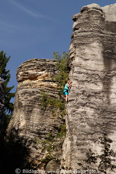 Klettern an steilen, senkrechten Felswand, am senkrechten Felsen zum Gipfel des Sandberges in Fotografie. Alpinismus, Kletterer, Bergsteiger, Klettern, klettersport, Hochklettern, Alpinisten, Felsklettern Aktivurlaub mit Nervenkitzel in Fotoarchiv Galerie mit exklusiven Poster prints