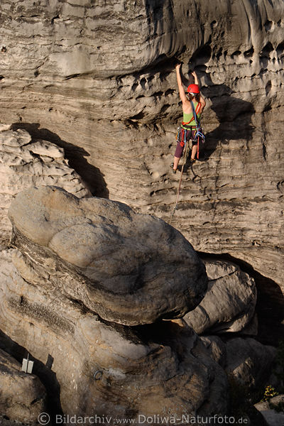 Bergsteigerin an Kletterwand, Felswand mit Löchern Spalten hochklettern an steilen senkrechten Felsen zum Gipfel des Sandberges Fotografie.