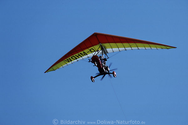 Motorgetriebene Segeldrachen werden im Flachland verwendet, weil man dort keinen Berg zum Absprung findet. Hier Drachenflieger Fotografie in Luft am Blauhimmel schwebend Drache mit Räder durch die Lüfte gleiten Flugbild, Kunstfliegen, Spassfliegen, Flugangebot für Mutige