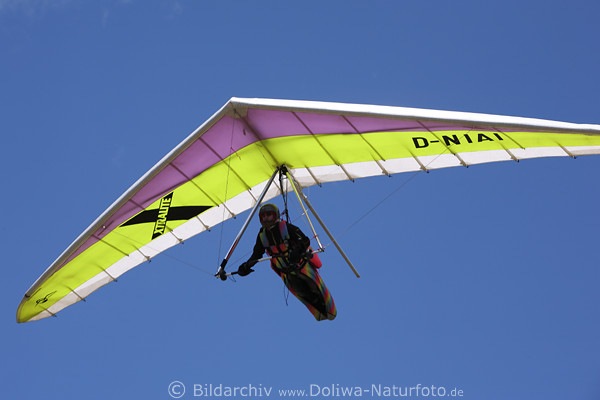 Xtralite Segeldrache Fotografie mit Pilot im Dreieck des Steuerrahmens fliegen schweben am Hängegleiter