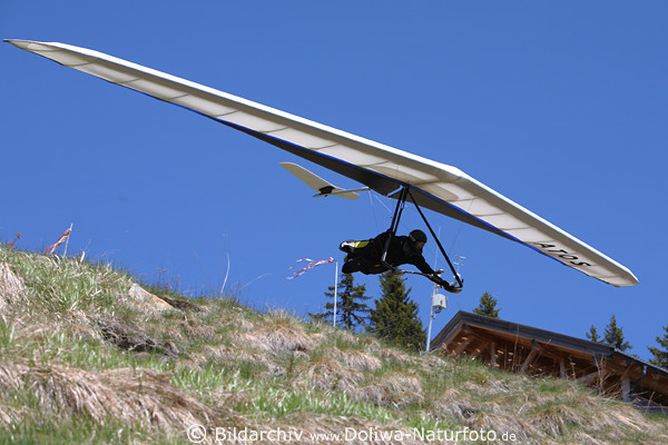 weiss-blau Segeldrache Flachflug am Boden unter Blauhimmel in Luft gleiten Fotografie Drachenpilot am Hängegleiter