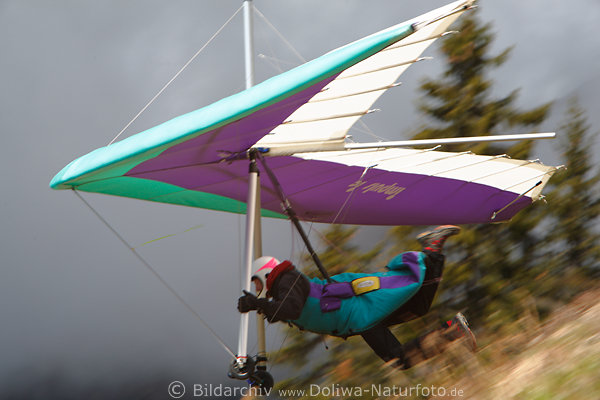 Drachenpilot Beine in Gräser laufend schwebend in Luft Flugstart Aktionfoto am Himmel unter grün-lila-weißem Flugdrache Hängegleiten Bewegung Unschärfe Postermotiv, Vollformat Abbildung, entscheidende Momente zum gelungenem Drachenflug