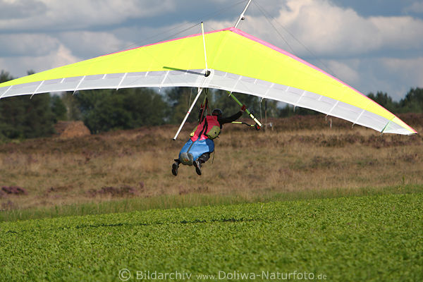 Hängegleiten Bild, Drachenflug Pilot unter buntem Drachenflugzeug am Hängegleiter (aus einem Aluminiumgestell) haltend am Himmel fliegen in Luft schweben, Deltasegeln Fotografie, Ein Drachen bespannt mit gelbem Tragsegel. Durch Gewichtsverlagerung kann der Pilot die Fluglinie steuern. Mit diesen Hängegleitern können Entfernungen bis über 300 Kilometern zurückgelegt werden