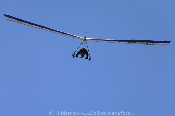 Drachenpilot Silhouette Fotografie im Befestigungsgurt angehängt unterm dem Drachen, Hände an der Steuerstange in Bild, lenkt den blau-weiß Exxtacy-Jumbodrachen durch Gewichtsverlagerung des Körpers. Räder an beiden Enden dienen manchmal als Hilfe bei eventueller Bauchlandung.
