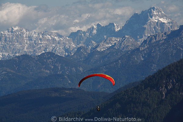 Freizeitflieger mit Gleitschirm Aufnahme in Alpenpanorama gleitsegeln zu Alpengipfeln in Lüften Fotografie über Berggipfel