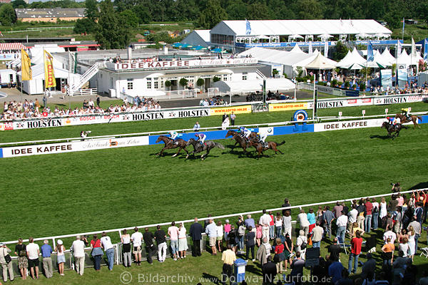54935  Pferde Galopper Turfarena Bild von oben, Galoppade auf Zielgerade im 5. Rennen, Zuschauer an Banden, Rennbahn in Hamburg Derby Meeting Wettbewerb Turffoto, City of Esteem (GB) mit Jean-P. Carvalho in Führung