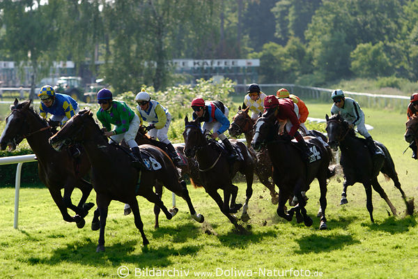 54983  Galoppade in Kurve Gegenlicht Bild Avec mit Toni Potters links und Karmie mit Rastislav Juracek (8) in Führung, Turf foto vom BMW Galopp Derby, Buchmacher Albers-Rennen 8, Hamburg Horn