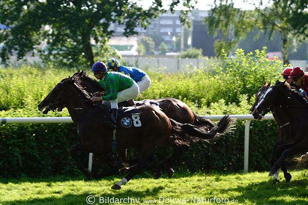 54986  Galoppade Pferderennen Gegenlicht Bild Karmie Rastislav Juracek (8) in Führung, dahinter Avec mit Toni Potters gefolgt von 2 Anderen Reiter, Turfrennen Fotografie von BMW GaloppDerby, Buchmacher Albers-Rennen 8, Hamburg Horn