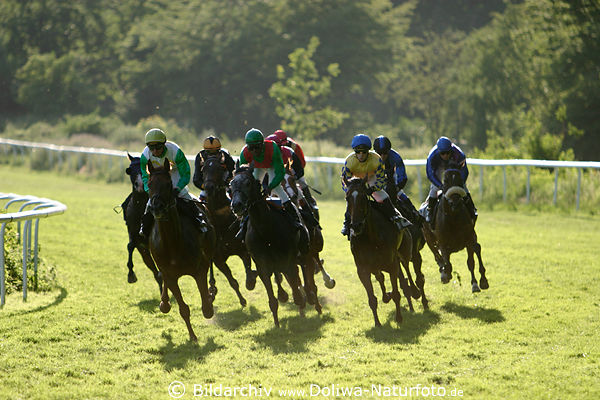 55002. Galoppfoto in Kurve Gegenlicht Romantik: Wellenfuchs W.Mongil, Kallimix Jockey E. Pedroza & Lason Norman Richter in Galoppade 10 Rennen, Preis des Romantik Hotels "Altes Gymnasium” BMW Derby Meeting in Hamburg Horn