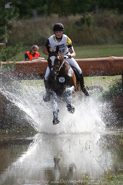 Vielseitigkeitreiterin Sportporträt springen durch Wasser, galoppieren nach Hürdensprung dynamisches Bild von Bad Segeberg Vielseitigkeit CCI1* open bei Junioren EM