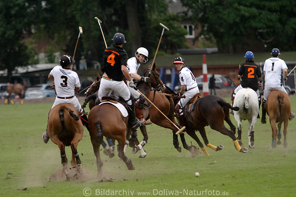 Poloreiter & Polospieler Taktik, Ballkampf Pferde in Galopp mit Polostick am Ball, Polomatch: Berenberg Bank gegen Bentley Hamburg Poloteam, weiss in Bild: Marc Pantenburg, Marcello Caivano, Wolfgang Kailing, Peter Kienast / Matt Eyre Brook. Pferde & Poloreiter, Poloplayer actionfoto as poster & print only here from Poloevent, Polopferde ritt im Chukker, Fotoreportage aus Klein Flottbek