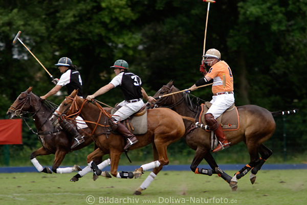 Trio zu Pferden im Galoppfoto bei Poloturnier Berenberg Polo-Derby 2007 in Hamburg, Chukker um Platz 5. Porsche - J.J. Darboven Poloteam Match, Reiter zu Pferd bei Polomatch, Poloplayer mit Stick reiten, Pferdesport in Klein Flottbek, Polo-horses dynymic-photo from Polo in Germany as poster print.