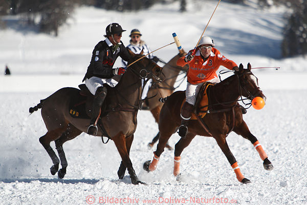Polospiel-Emotionen Sport Aktionbild auf Schnee in Galopp mit Polosticks. Weltcup auf Moritzersee in der Schweiz